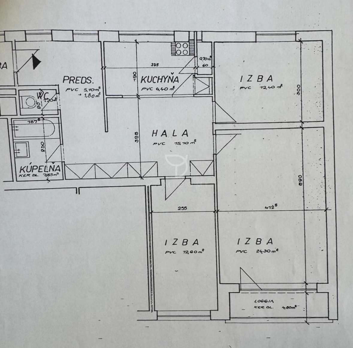 Rozloha bytu je 83,7 m2 + Loggia 4,8 m2 + pivnica 1,8 m2.