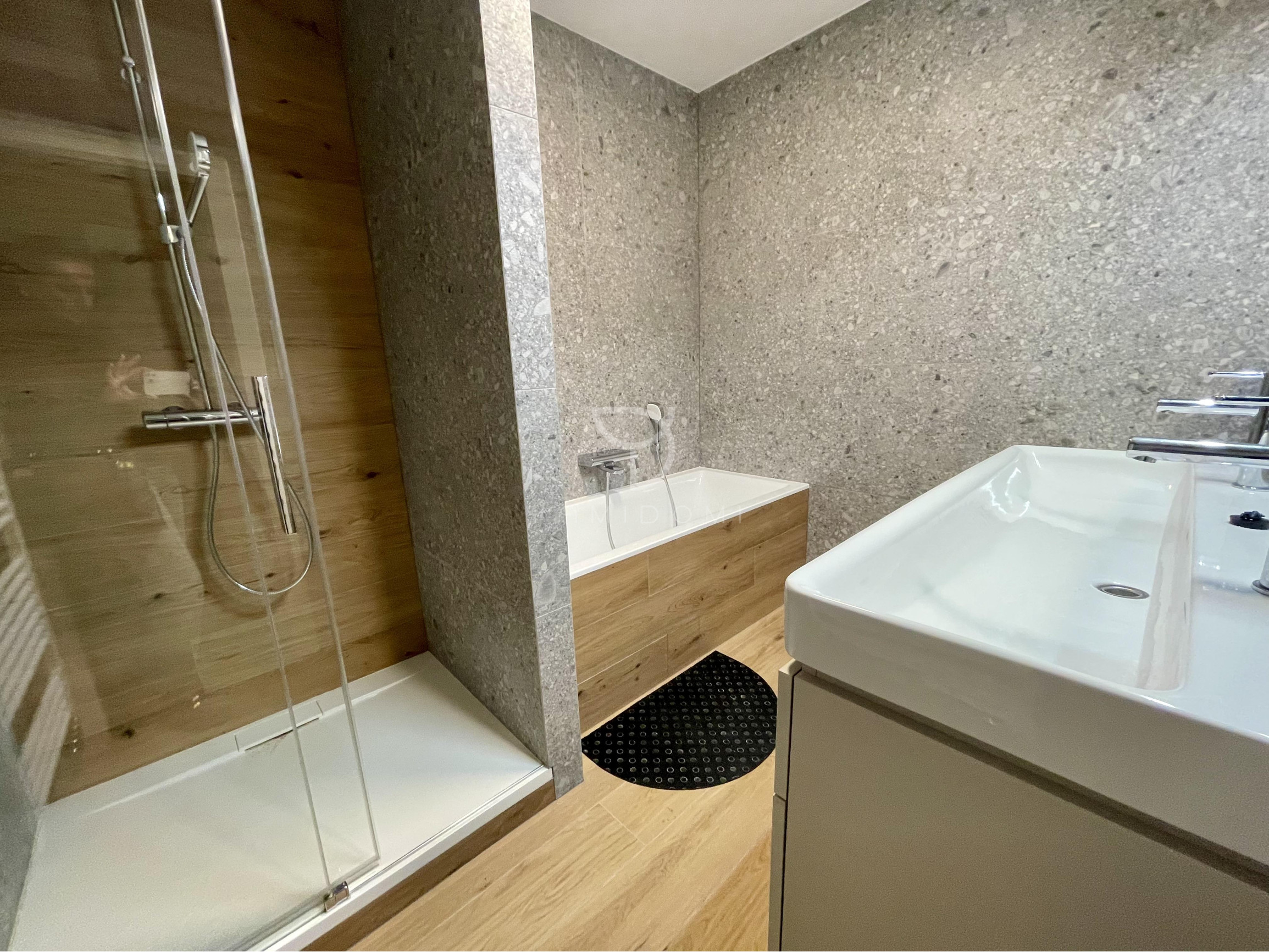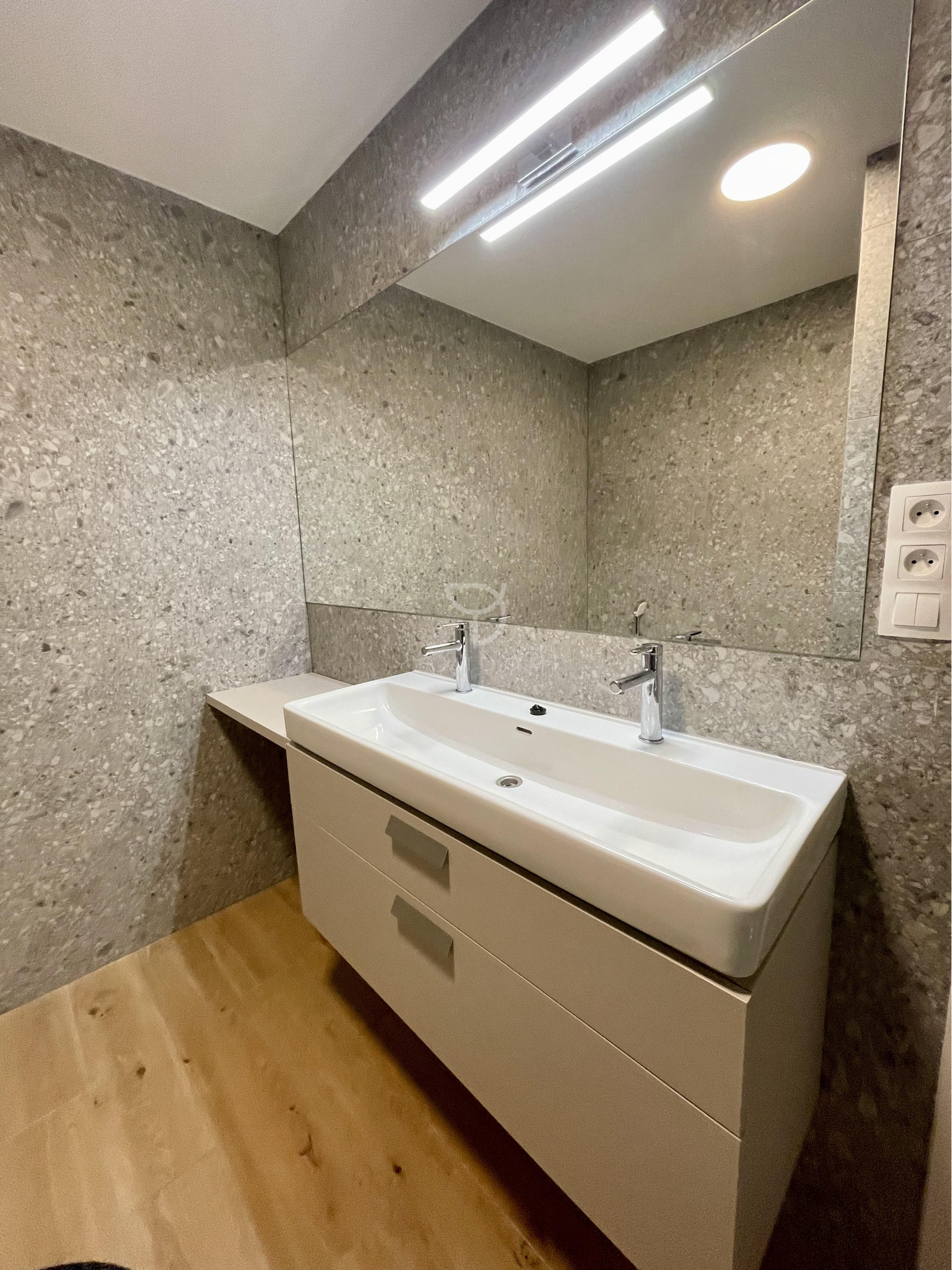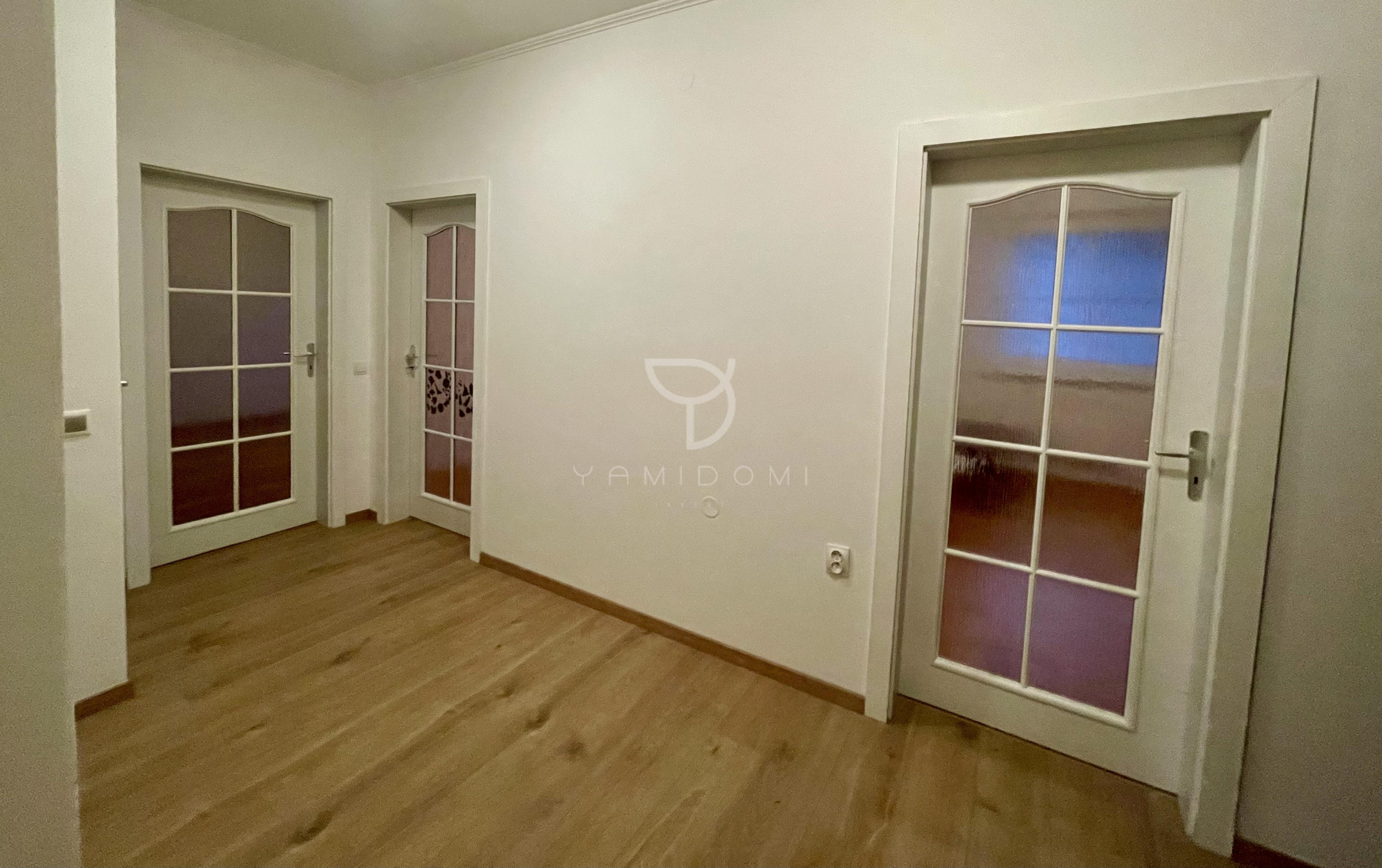 The layout consists of an entrance hall, a spacious and open living room connected to a new fully equipped kitchen with appliances and a dining area, 3 separate bedrooms, a modern newly renovated bathroom with a bathtub and shower and a separate toilet. The apartment includes a garage and indoor parking spaces.