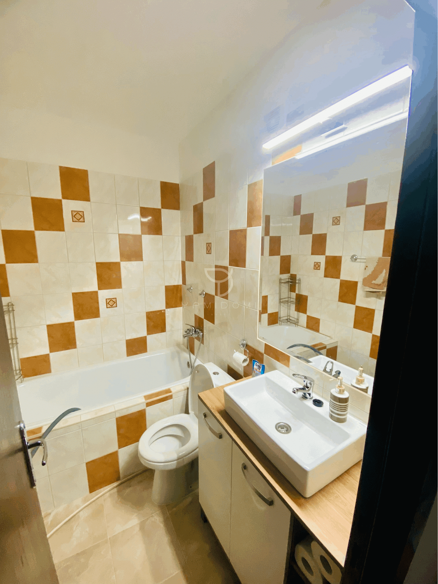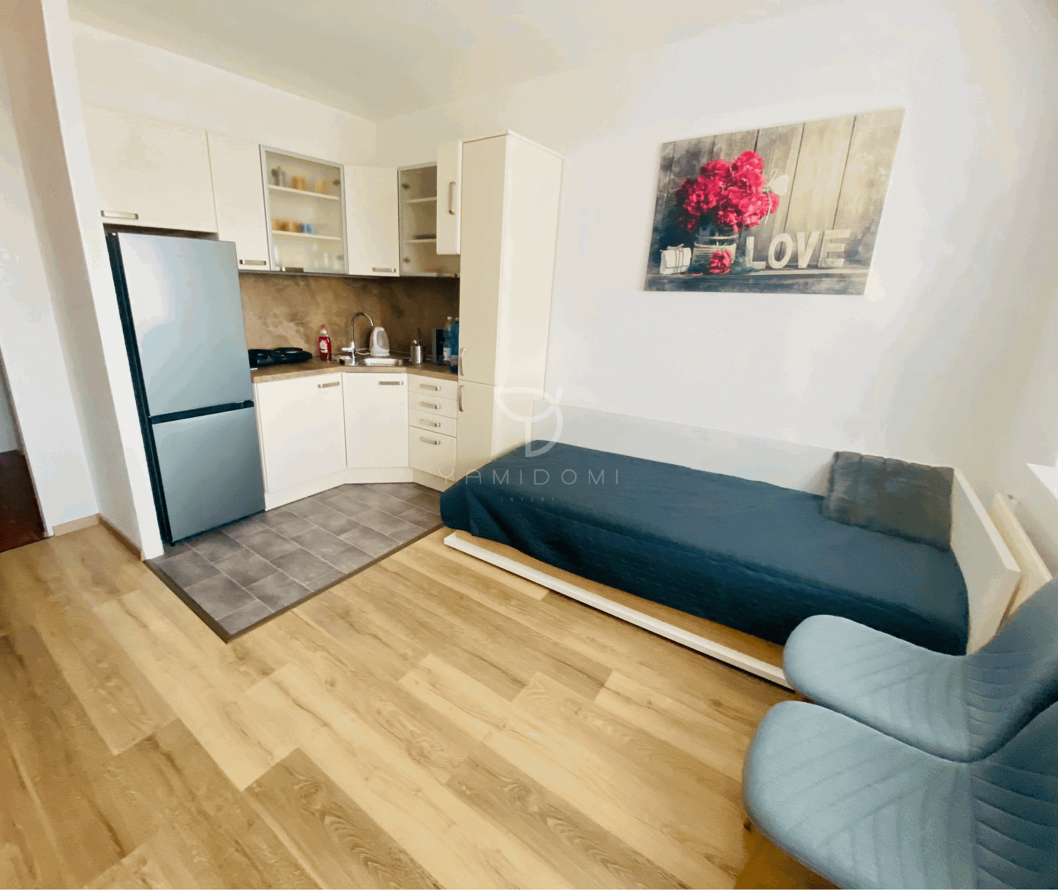 Dispozícia: Otvorená obytná časť so spojenou kuchynskou a spálňovou časťou, kúpeľňa s vaňou a toaletou.