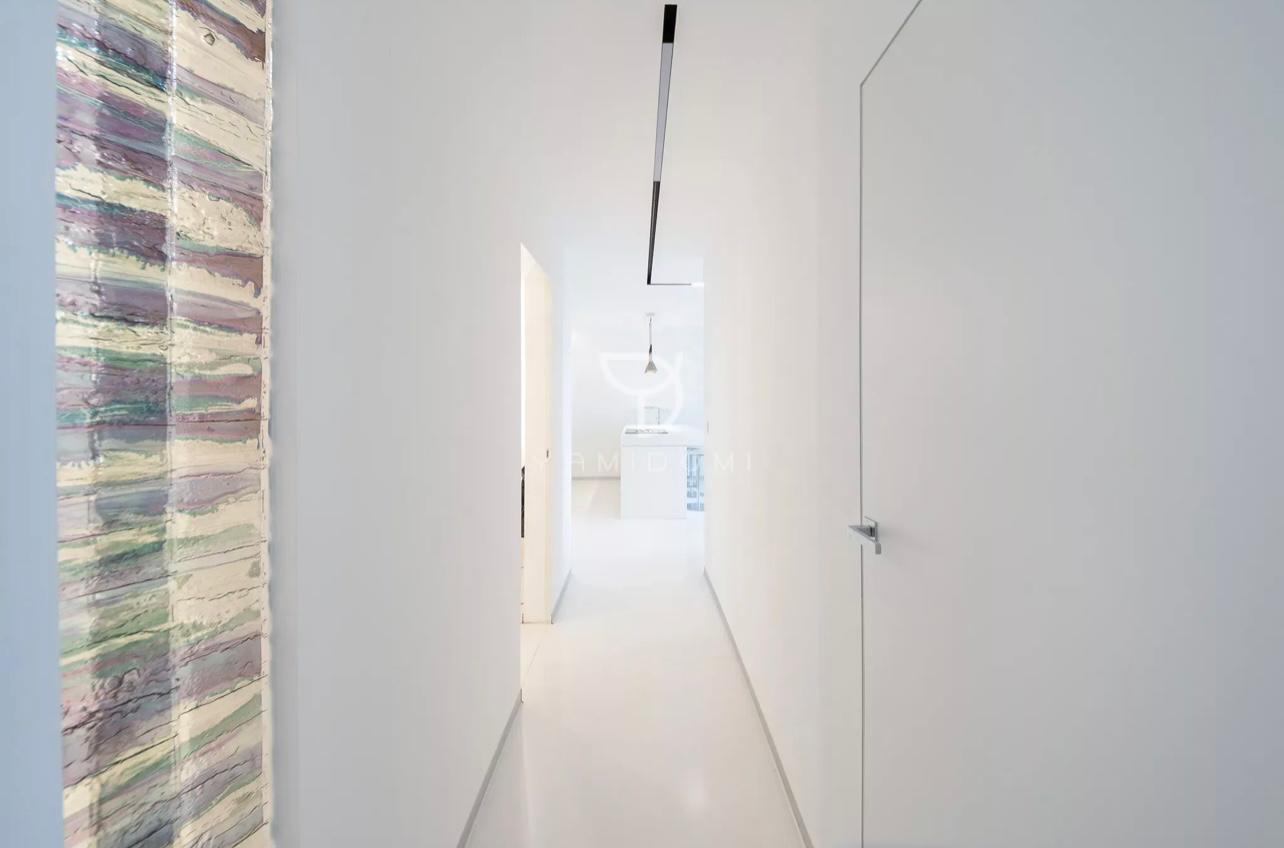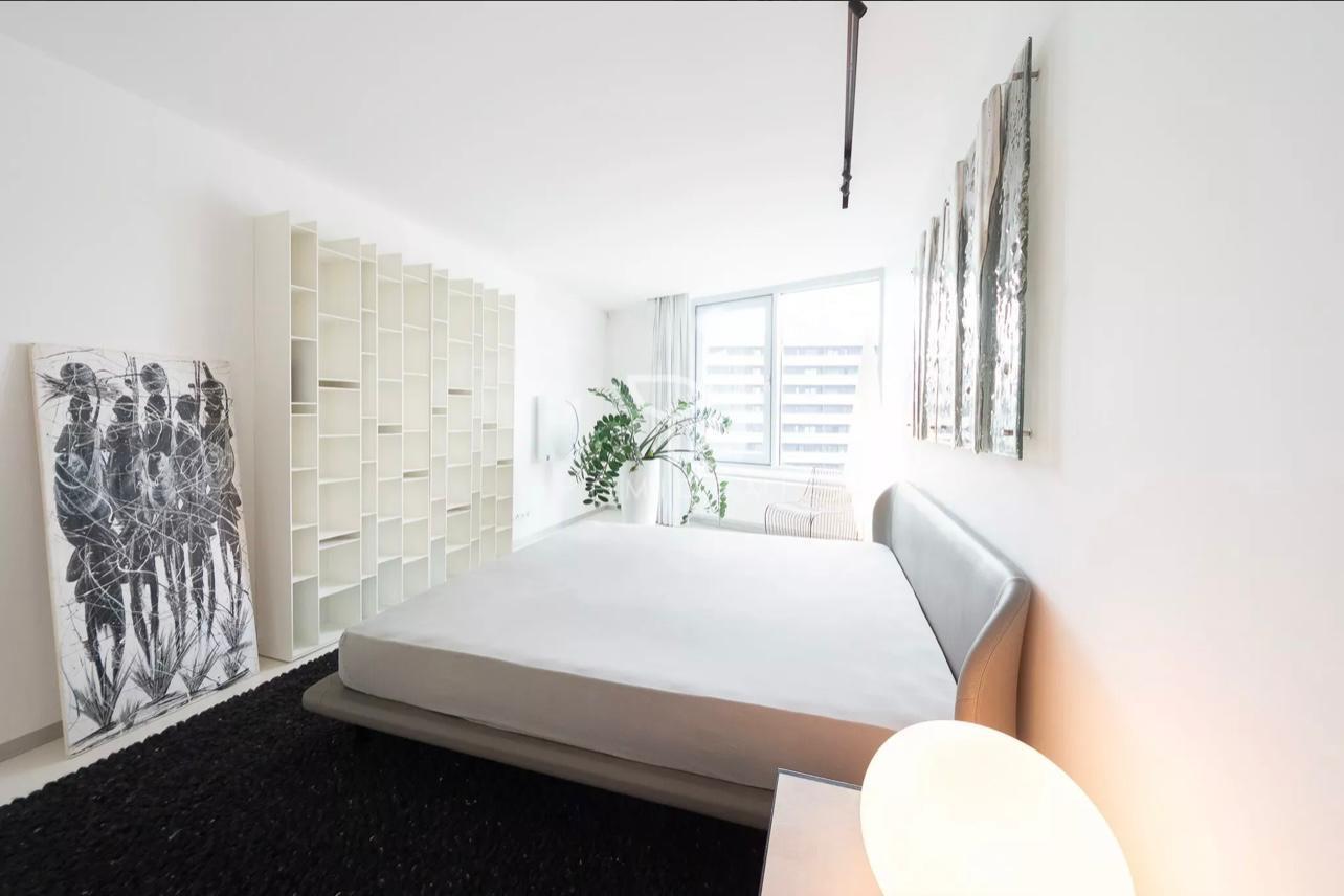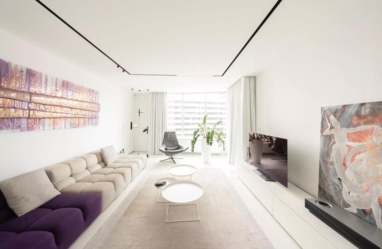 Moderné liate podlahy a bezfalcové interiérové dvere dotvárajú nadčasový interiér bytu vrátane dokonalého osvetlenia, ktorý vytvára príjemnú harmóniu. Čisté línie a citlivo farebne navrhnutý interiér je obohatený o umelecké diela Gordany TURUK.
