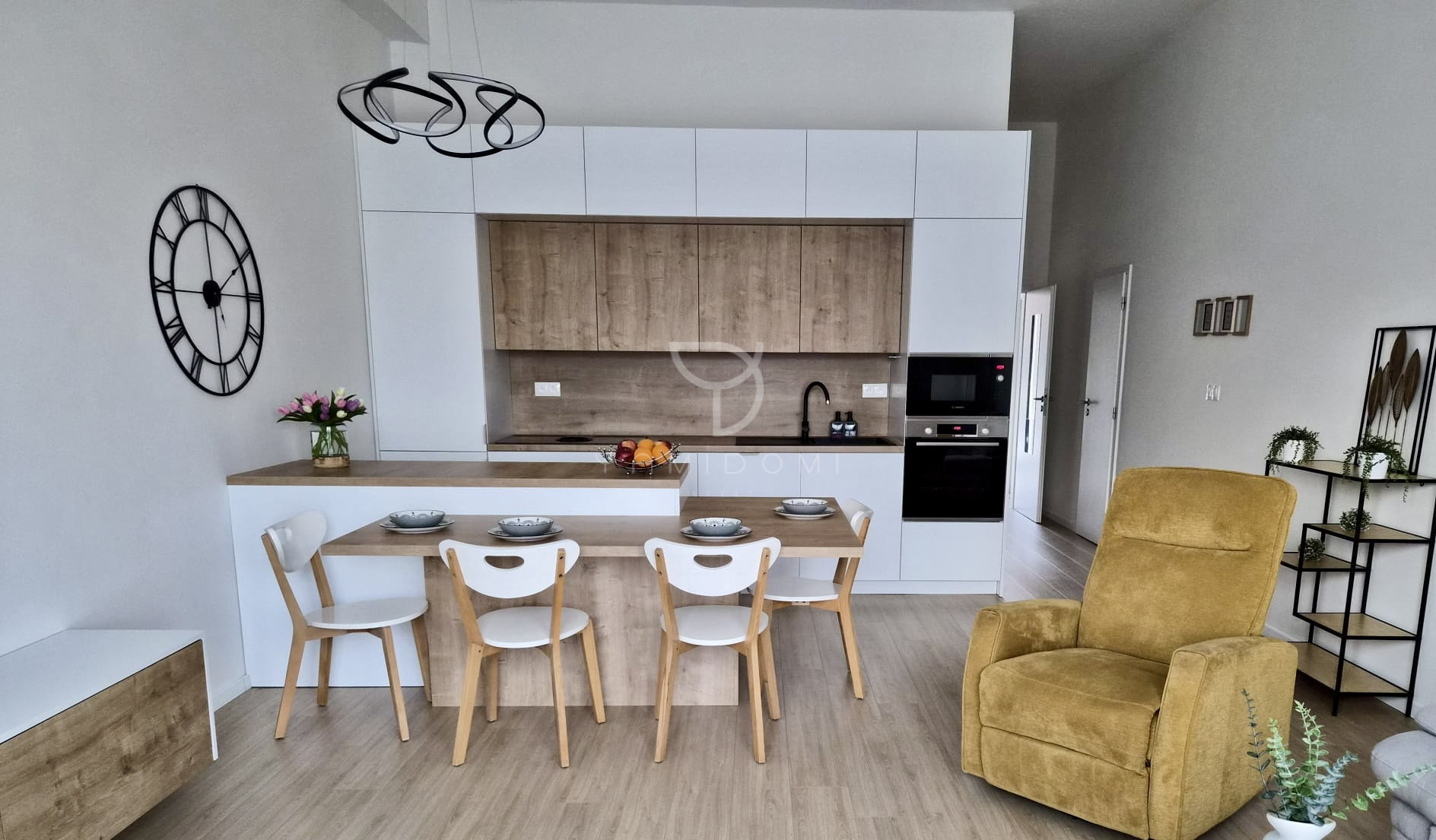 • vstavané spotrebiče: chladnička s mrazničkou, mikrovlnná rúra s grilom, rúra na pečenie s množstvom automatických programov, indukčná doska s integrovaným odsávaním pár a umývačka riadu s automatickým otváraním dvierok na dosušeni